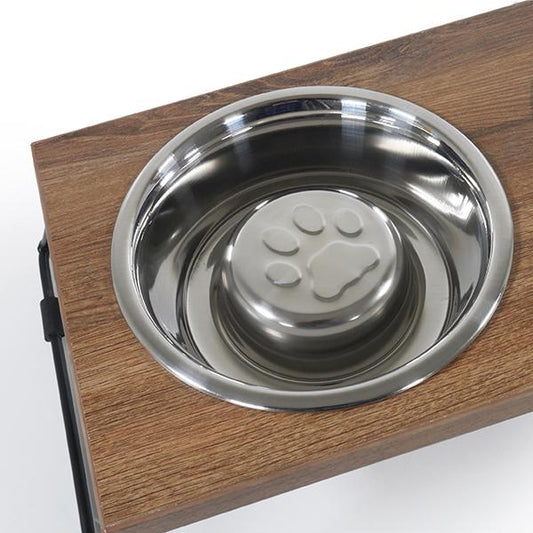 🐶 Wooden Raised Double Dog Bowl Slow Feeder – Stainless Steel Diner (46cm)
